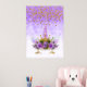 Affiche violette d'un visage de licorne, avec corne d'or et cils dorés, tête-d'oeuvre fleurie violette, dressée contre un arrière - plan de nuages violets et d'étoiles dorées. Cette affiche ferait un grand cadeau de baby shower pour une petite fille, ou un ajout idéal à la chambre d'une petite fille, à la crèche de bébé ou à la chambre d'un autre enfant
