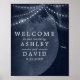Poster d'accueil du Mariage bleu Rustic Heart Tree String Lights. Belle élégante enseigne de mariage campagnard avec une sensation de rêve éthérée. Des lumières scintillantes des arbres pendent du sommet des arbres. Un coeur sculpté se trouve sur l'arbre en attendant vos initiales monographiques. Ce design personnalisé et moderne peut facilement être personnalisé avec vos propres détails.