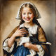 "Affluent Innocence" "Cornelia" Girl With Puppy" : Dans cette captivante représentation de la vie aristocratique au 17ème siècle en Hollande, une jeune fille néerlandaise est un symbole de richesse et d'innocence, ses traits délicats illuminés par un doux sourire en bercant un chiot moelleux dans ses bras. Avec ses cheveux ornés d'élégantes tresses et sa tenue qui lui convient parfaitement, elle respire le raffinement et la grâce. Le chiot, niché contre elle, reflète son innocence juvénile avec son propre regard d'âme, créant un tableau harmonieux de la compagne et de la tendresse.