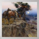 Charles (CM) Russell, le "cowboy artiste", a créé plus de 2 000 peintures de cowboys, indiens et paysages dans l'ouest des États-Unis. Il vécut et travailla parmi les cowboys et la tribu des Blood Indian dans ses plus jeunes années. Ce tableau s'appelle "Innocent Allies" et représente 3 chevaux qui attendent patiemment pendant que leurs coureurs volent un entraîneur de scène.