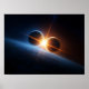 A dramatic and hyper-realistic digital illustration capturing a pivotal cosmic event where two celestial bodies, one glowing cool blue and the other warm orange, appear to collide or pass closely, creating a brilliant, radiating starburst effect where their light beams intersect. The scene is set against the deep black of space with a subtly illuminated planetary curvature in the foreground, emphasizing the vast scale and power of interstellar phenomena.