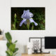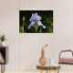 Joli périwinkle iris avec centre blanc et barbe jaune et bourgeons prêts à ouvrir dans l'arrière - plan. Des gouttes de pluie sur des pétales délicats. Les arbustes verts sont floues au loin. Photographie originale © TamiraZDesigns.