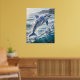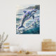 A radiant iris dolphin leaps through sparkling waves where ocean joy meets floral elegance. Realistic dolphin anatomy blends with iris petals, sleek fins, flowing botanical textures, and luminous accents in blue, violet, aqua, silver, and pale gold. Rainbow mist, sea spray, coastal cliffs, seabirds, and layered water reflections create an uplifting cinematic scene full of movement. This premium fantasy marine design brightens bathrooms, beach homes, nurseries, or gift collections. Perfect for dolphin lovers, coastal decor fans, and joyful ocean-inspired interiors.