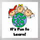 Three stick figure kids surround a world globe and text reads "It's Fun to Learn !" on school themed T-shirts, cards, mugs, stickers, buttons, and other gear !