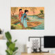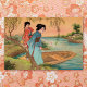 En un coup d'oeil cette image a l'apparence d'une impression de bloc de bois. En y regardant de plus près, vous remarquerez le motif gracieux d'un chromolithographe en pierre de l'époque victorienne. Les couleurs douces et le design illustrent une scène japonaise au bord du lac avec deux geishas et un bateau. Les saules et le ciel abricot encadrent l'image colorée. Il s'agit d'un design enchanteur pour la décoration, la correspondance personnelle et les accessoires.