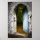Image orientée portrait représentant un mur en pierre vieux de plusieurs siècles avec un portail bleu vieilli. La porte est à côté, ce qui laisse entrevoir le jardin luxuriant et le sous-bois feuillu derrière.