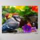 Cette affiche colorée présente un pot bleu qui s'est posé sur une terrasse de porche entourée de fleurs. La couleur bleue, grise, blanche et noire de l'oiseau est déclenchée par une émeute de couleur. On y trouve une théière décorative aux nasturtiums orange et jaune et une pétunia violette. Les feuilles verts complètent ce kaléidoscope de couleurs.