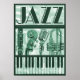 Poster de musique de jazz vert foncé avec une variété d'instruments de musique dont une clarinette, basse droite, vieux microphone, trompette, piano et un batteur. Idéal pour l'amateur de musique, l'enseignant ou l'étudiant.