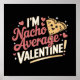 Le design comporte une phrase puny : "Je suis Nacho Valentin moyen !" Le mot "Nacho" est un jeu sur l'expression "pas votre". Le texte est placé dans une police de caractères gras et stylisée avec une texture brillante et brillante dans un dégradé pastel de rose et d'orange. Un élément central de la conception est une puce en nacho en forme de coeur de dessin animé avec un visage souriant, recouvert d'une garniture cheesy. L'ensemble du graphisme est orné de petits coeurs et d'étoiles, ajoutant à son ton charmant et affectueux. L'arrière - plan noir rend les couleurs chaudes et éclatantes de la pop design, ce qui en fait un choix parfait pour une carte de voeux, un t-shirt, ou un poste de médias sociaux.