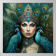 Jennabeth est un portrait imaginaire d'une belle femme avec deux paons assis sur ses épaules. Son chef-d'oeuvre est fait de magnifiques plumes de paon et de bijoux turquoise encastrés dans l'or. Elle porte un étonnant choker orné de bijoux turquoise assortis aux bijoux de la tête. Le travail du métal dans la chaudronneuse est élaboré et réalisé par un artisan compétent. Elle porte une robe avec une soie motif paon. Jennabeth est magnifique avec les yeux bleus surlignés de turquoise et marron. Un beau portrait d'imaginaire.