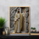Dans la douce lueur d'un nouveau jour, une figure incarnant Jésus se dresse sur une porte patinée en bois, encastrée dans un mur en pierre. Son doux coup attend une réponse, symbolisant une invitation à l'éveil spirituel. La scène tranquille est baignée par la lumière chaude du lever du soleil, évoquant l'espoir et le renouveau qu'apporte une nouvelle journée. La lumière matinale paisible souligne l'intemporalité de cette scène, comme Jésus se tient patiemment à l'ancienne porte, Sa présence incarnant l'amour et la compassion. La porte patinée et le mur en pierre robuste transmettent un sens de l'histoire et de la permanence, en contraste avec le rayonnement de la nouvelle aube. Cette oeuvre d’art émouvante invitation les spectateurs à réfléchir à l’appel doux du Christ et à l’invitation constante au renouveau spirituel. Qu'il soit exposé dans un espace sacré ou dans un cadre personnel, il offre un rappel inspirant d'espoir, de foi et de connexion divine.
