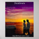 Le Desiderata complet de Max Ehrmann : Allez tranquillement au milieu du bruit et de la hâte. est une photo d'une belle photo d'une silhouette d'un jeune couple amoureux debout au bord de la mer avec la belle lumière bleu violet et orange et jaune ciel.Le Desiderata complet est un poème populaire Le poème bien aimé écrit par Max Ehrmann en 1872-1945 magnifiquement illustrée par les couleurs brillantes qui se reflètent au large de l'eau.