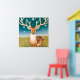 Illustration détaillée d'un cerf aux bois de bois dans un paysage serein et enneigé avec verdure et champignons.