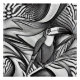 Un toucan avec un bec proéminent est représenté au milieu de motifs monochromatiques tourbillonnants qui évoquent un sentiment de mouvement des feuilles de la jungle. Le design à contraste élevé accentue les caractéristiques de l'oiseau au milieu des formes abstraites qui l'entourent.