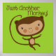 Un mignon singe brun avec une très longue queue et un texte marron qui dit Just Another Monkey sur les T-shirts, tasses, sacs, cartes, coussins, autocollants, magnets, gardiens, horloges murales et autres articles pour enfants et adultes.