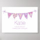 Balises de jolis pavés affiche du nom d'art parfait pour une chambre d'une fille ou salle de jeux dans les tons violet, rose, jaune crémeux et blanc. Personnalisez avec votre propre initiale de votre enfant sur le drapeau du milieu, nom et nom signifiant pour une touche vraiment personnalisée à la chambre ou à la crèche de votre enfant, cet exemple est pour le nom Katie Pure et innocent. Ambitieux avec une volonté forte. Impression d'affiche mignonne girlie idéale pour une nouvelle petite fille, baptême ou cadeau baby shower. Dessin unique, art graphique et design par Sarah Trett pour www.mylittleeden.com