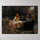 Le tisserand interdit : une histoire inspirée de "La Dame de Shalott" Dans un monde tissé de secrets et de malédictions, vivait une jeune femme connue seulement comme la Dame de Shalott. Confinée à une tour isolée sur une île, elle était liée par un mystérieux décret. Le monde extérieur, une tapisserie de vie vibrante qui se dirigeait vers le grand Camelot, est resté un spectacle interdit. Elle n'a pu la voir qu'à travers un miroir magique, ses reflets peignant des images éphémères sur son métier à tisser. — Les jours de la dame étaient remplis du clic rythmique de son métier à tisser, des contes d'un monde qu'elle ne pouvait pas toucher. Les murmures de vent qui se balançaient à travers les saules et le lointain bavardage des cueilleurs étaient ses seuls compagnons. Pourtant, une aspiration s'est épanouie en elle, alimentée par les murmures d'une malédiction ; une malédiction qui menaçait son existence même si elle osait regarder directement le monde. — Un jour fatidique, le miroir trahissait ses reflets banals habituels. Il chatouillait, révélant un chevalier de grâce sans pareil, son pied blanc contraste fortement avec le paysage verdoyant. Sir Lancelot, son nom repris dans une chanson oubliée, a volé le souffle de la Dame. Incapable de résister à l'attrait de son image, elle défia la malédiction, tournant son regard vers la fenêtre interdite. — Le monde a inondé ses sens, une symphonie de couleurs et de sons. Mais avec cet aperçu volé est venu la confirmation effroyable de la malédiction. Alors qu'elle criait un cri étouffé, son monde s'est dissous dans le chaos. Le métier à tisser, compagnon de sa vie, était abandonné, ses fils reflétant la décomposition de son destin. — Cette histoire, bien qu'elle soit née des vers du poème hantant d'Alfred Lord Tennyson "La Dame de Shalott", transcende la page. Il s'agit d'un chef-d'oeuvre visuel mis en valeur par les coups de pinceau de John William Waterhouse. — John William Waterhouse (1849-1917), un peintre préraphaélite renommé, a capturé l'essence du poème dans son oeuvre emblématique de 1888. La Dame, drapée de cramoisi, est prête pour un voyage le long de la rivière. Sa beauté pâle reflète à la fois la défiance et le désespoir. Le métier à tisser abandonné, les bougies renversées et le bateau à débordement parlent tous d'une vie coupée en deux. Le tableau, comme le poème, nous feuilles à réfléchir sur les conséquences des désirs interdits, le pouvoir du destin, et la beauté piégée dans l'isolement. — Alfred Tennyson (1809-1892), pilier de la poésie victorienne, écrivit "La Dame de Shalott" en 1832. Le riche symbolisme et le narratif captivant du poème ont résonné avec Waterhouse, l'inspirant à traduire les versets en un chef-d'oeuvre visuel. Ensemble, le poème et la peinture offrent une exploration intemporelle des émotions humaines et le prix de l'aspiration à une vie hors de portée.