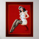 The Maid by American Painter Peter Driben (1903 - 1968); peintre, illustrateur et l'un des peintres les plus prolifiques des années 1940 et 1950. Illustration séduisante et sexy d'une beauté aux cheveux raven, revêtue d'un uniforme de bonne très révélateur. Elle a autour de ses cheveux un large ruban rose qui cravate sur le dessus de sa tête un arrangement fleuri. L'uniforme blanc de domestiques a une coupe en v profonde au centre et est sans manches, avec juste un peu de dessus devrait flamber avec des accents rouges rouillés dessus. Le long des côtés près de ses hanches se trouvent trois ovales découpés qui deviennent progressivement larges de haut en bas et les poches de l'uniforme dans lesquelles elle a les mains cachées ont rouillé le long du bord supérieur. Elle est assise sur le bord d'un poutre en bois incurvé, en révélant ses belles jambes couvertes de bas noirs, juste au-dessus de sa cuisse, avec une bande orange sur sa cuisse gauche, et portant des chaussures de talon haute à talon ouvertes en noir. L'arrière - plan de l'image est un léger rouge abstrait avec des contours oranges fines autour de son corps.