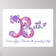 Jolie affiche de monogramme artistique avec le nom initial parfait pour la chambre ou la salle de jeux d'une fille dans des nuances de gris, blanc, jaune, rose et violet. Personnalisez avec le prénom court de votre enfant commençant par B, et la signification du nom pour un toucher vraiment personnalisé pour la chambre ou la nurserie de votre enfant, cet exemple est pour le nom B Beth House of figs. Bénie avec générosité et style. Jolie impression idéale pour un nouveau-né, un baptême ou un cadeau de baby shower. © Dessin unique de cœurs et de fleurs en monogramme à la lettre B et conception graphique par Sarah Trett. www.sarahtrett.com pour www.mylittleeden.com