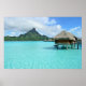 Affiche d'une station de bungalows de luxe surplombant l'eau dans le lagon bleu clair de l'île pacifique de Bora Bora, près de Tahiti en Polynésie française.