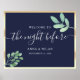 Élégant, moderne, botanique, simple or et bleu marine La veille du dîner de répétition carte de bienvenue avec écriture calligraphiée à la main.