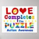 L'autisme inspirationnel cite, L'amour complète le puzzle, avec des pièces colorées de puzzle de l'autisme et un beau papillon pour soutenir les enfants autistes et leurs familles.