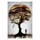 Un arbre imposant, ses racines entrelacées comme des souvenirs anciens, garde des secrets parmi les feuilles dorées et rougeâtres. Une silhouette humaine observe, tandis que les oiseaux volent librement, unissant la nature et l'âme dans une étreinte poétique. Chaque coup de pinceau à l'aquarelle est un soupir de paix, nous rappelant que la vie grandit dans les racines et les rêves.