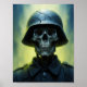 Un soldat squelettique est une relique de la guerre, son crâne fracturé couronné d'un casque fissuré, enfermé dans une veillée éternelle. Entourée d'une lueur obsédante de jaune et de bleu, la figure incarne à la fois les horreurs des champs de bataille oubliés et la persistance inflexible de la mort. L'uniforme s'accroche à un corps longtemps décomposé, évoquant l'image d'une armée qui n'a jamais quitté les lignes de front - un sentinelle fantomatique dont le silence parle plus fort que le chaos qu'il a enduré autrefois.
