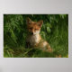 Poster avec une photo montrant un mignon petit renard à fourrure rouge et blanche. Entouré de feuilles et d'herbes verdoyants.