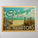 Ce design de carte postale vintage de Greutt From The Hamptons dispose d'une plage de sable avec une belle eau turquoise de l'océan et au-dessus de la mer, un ciel bleu avec des nuages blancs lustrés. Dans un style de voyage vintage.