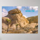 L'image présente un paysage désertique avec d'importantes formations rocheuses et des arbres Joshua. Les roches marron clair et larges sont le point central, avec des formes arrondies et lisses et des crevasses profondes. Deux Joshua Trees sont au premier plan, leur feuillage vert épicé qui contraste avec l'environnement aride. Le sol est recouvert de brosse sèche et de végétation basse.