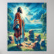 Cette oeuvre saisit de façon saisissante le moment de la Genèse 15, quand Abram regarde vers le haut dans la foi, debout devant un autel en pierre sous un ciel bleu radieux. Habillé de robes colorées et fluides de rouge, d’orange et de blanc, la posture sereine d’Abram incarne sa foi inébranlable dans la promesse de Dieu. La scène est entourée d'une pelouse luxuriante, de collines ondoyantes et d'une campagne paisible qui renforce la tranquillité sacrée du moment. L’autel, élaboré avec des détails complexes, est le symbole de la dévotion d’Abram. Enfermé dans un cadre circulaire contre un arrière - plan noir frappant, le design évoque un sentiment de respect intemporel, parfait pour célébrer ce moment biblique crucial.