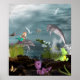 Une jeune sirène aime chevaucher les vagues sur le dos de son ami dauphin tandis que d'autres amis regardent.