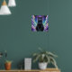 Cette affiche fantaisiste présente un chat tabby assis au milieu d'un paysage de rêve imaginaire, et un magnifique ciel de nuit magique plein d'étoiles. Fini dans une peinture à l'huile multicolore vibrante.