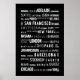 Affiche en noir et blanc avec les noms des célèbres villes du monde.