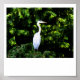 Un tableau numérique d'un Grand Héron Bleu, peint en blanc, posé sur un arbre dans un bois.
