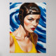 Peinture à l'huile Art Déco, extrêmement spectaculaire, ce gros plan saisit la détermination inébranlable d'une femme surfeuse, sa peau d'ivoire impeccable et son costume jaune canari rendu en couleurs primaires audacieuses contre une vague abstraite et tourbillonnante de bleu cobalt.