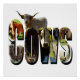 Pictured is the word cows made with inverted cow images and a highland cow behind it