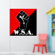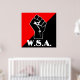 main gauche poing noir, "w.s.a." sur rouge et noir [poing avec pouce recouvrant les knuckels est la langue des signes pour la lettre "s".]