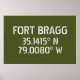Coordonnées de la carte de latitude et de longitude pour Fort Bragg, près de Fayetteville, Caroline du Nord Police blanche de style Sercil sur arrière - plan vert de l'Armée.
