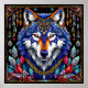La tête de loup stylisée de façon frappante, caractérisée par des motifs complexes et des couleurs vives. La fourrure du loup est principalement un mélange de bleu et de blanc, avec des accents orange vif qui mettent en valeur le visage et les oreilles. Autour du cou, une chaîne décorative apporte une touche de décoration. L'arrière - plan est orné de différentes formes colorées, cristaux et feuilles, qui rehaussent l'aspect mystique et artistique général de la pièce. De plus, des éléments décoratifs tels que des perles et des ornements pendent des côtés, contribuant à une atmosphère bohème.