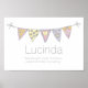 Joli pavé drapeaux affiche de nom d'art parfait pour une chambre pour filles ou salle de jeux dans les tons gris, blanc, jaune, rose et violet. Personnalisez avec votre propre initiale de votre enfant sur le drapeau du milieu, nom et nom signifiant pour une touche vraiment personnalisée à la chambre ou à la crèche de votre enfant, cet exemple est pour le nom Lucinda. Mignonne affiche idéale pour un nouveau bébé, un baptême ou un cadeau de baby shower. Dessin unique, art graphique et design par Sarah Trett. www.sarahtrett.com pour www.mylittleeden.com