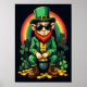 Un leprechaun avec un sourire espiègle, portant un chapeau vert et des lunettes de soleil, est assis sur un tas de pièces d'or. Il accroche un pot débordant d'or, entouré de trèfles à quatre feuilles et d'une voûte arc-en-ciel au-dessus.