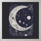 Diseño Sutil y Caprichoso: Presenta una luna caprichosa dibujada solo con contornos en blanco y negro, rodeada de acentos celestiales y estrellas brillantes que le dan un toque mágico y etéreo.
