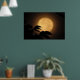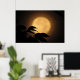C'est l'automne, et une lune jaune doré et lumineuse s'est élevée derrière les silhouettes noires de feuilles soufflant dans la brise sur ce poster de photographie d'art dramatique. L'arrière - plan est illuminée dans les tons orange, or et marron pour créer un motif abstrait dans un motif asiatique.