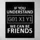 Ce drôle de design machiniste cnc dit "si vous comprenez g01 x1 y1 nous pouvons être amis".La conception comporte un code g.