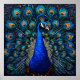 Magnifique paon, affichant en évidence son plumage vibrant. Le corps du paon est d'un bleu profond et riche, et il a un long et élégant cou qui mène à une tête gracieusement voûtée. Ses plumes sont minutieusement détaillées, avec un ensemble de teintes irisées bleu et vert, accentuées par des motifs qui frappent les yeux dans les tons or et orange. L'arrière - plan est sombre, ce qui augmente la luminosité et la vivacité des plumes du paon, créant un contraste visuel étonnant. La composition générale dégage un sentiment de beauté et d'élégance, qui capte l'attrait de cet oiseau emblématique.
