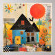 Maison faite d'un collage de pièces et de textures, coloré et amusant à regarder.