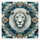 Il s'agit d'une magnifique oeuvre d'art qui présente au centre un visage de lion stylisé. La crinière du lion forme un design de mandala, avec des lignes blanches et grises fluides créant un sens du mouvement et de la texture. Autour de la face sont des motifs complexes qui s'étendent vers l'extérieur, avec des formes florales et géométriques dans les tons bleu, turquoise et beige. Ces éléments contribuent à un sentiment de profondeur et de symétrie. L'arrière - plan est un turquoise profond, parsemé de minuscules taches d'étoiles, donnant à la pièce une ambiance céleste et mystique. L'oeuvre mélange harmonieusement les thèmes naturels et fantastiques, créant une composition visuellement captivante.