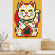 Cette illustration éclatante présente un Maneki Neko japonais traditionnel, ou "Chat chanceux", représenté dans un style charmant et fantaisiste. Le chat est montré assis debout, soulevant sa patte gauche dans un geste d'accueil qui est censé apporter la chance et le bonheur. Le chat a une expression délicieuse et joyeuse, avec ses yeux larges et sa bouche courbée dans un sourire doux. Le Maneki Neko est principalement blanc avec des taches de jaune et de rouge, ajoutant une touche de gaieté et de coloris au design. Il porte un collier vert orné d'une cloche en or, symbolisant richesse et prospérité. Le chat tient une grande pièce rouge avec des empreintes de pattes noirs, en soulignant son rôle de porte-bonheur et de bonne fortune. L'arrière - plan présente un cercle rouge audacieux, rehaussant l'apparence brillante et joyeuse du chat. Le design d'ensemble a une texture rétro, légèrement en détresse, lui donnant une sensation nostalgique et intemporelle.
